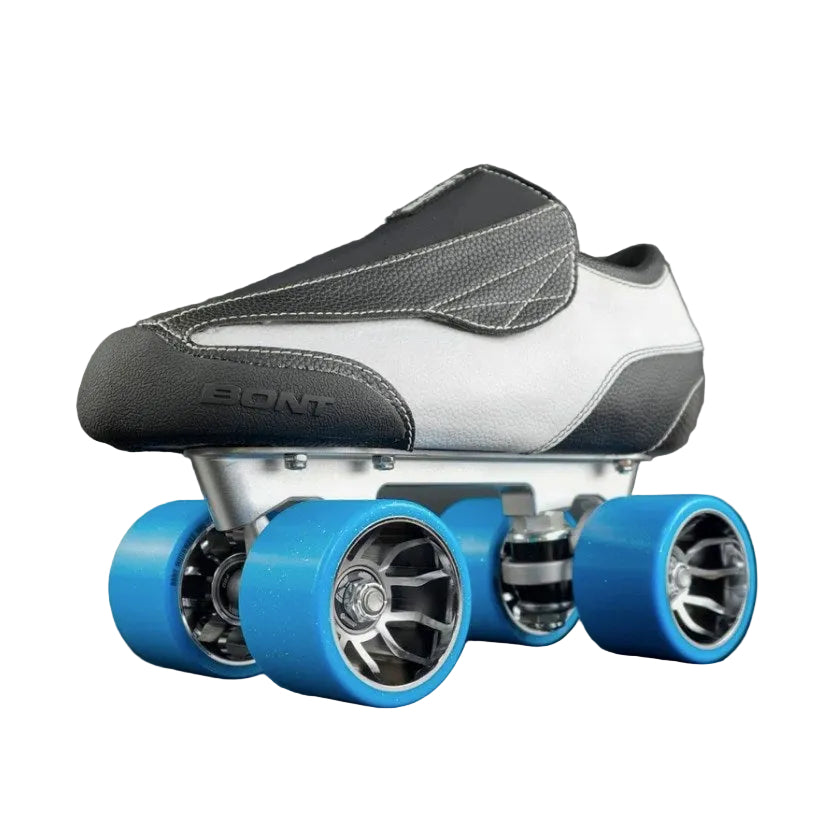 - Moonwalk Wheels for Speed & Style: 64mm, 96A wheels with Bont’s proprietary indoor urethane, featuring vibrant fluorescent blue sparkle and electroplated silver 6061 aluminium hubs for superior grip, rebound, and shine (8-pack included).