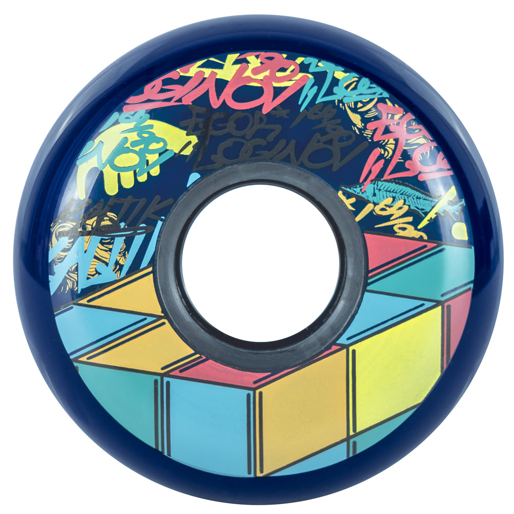 The Egor Loginov pro wheel from the guys at Kaltik is a 64mm rounded profile wheel in a 90a urethane. The deep blue colour paired with the creative colourful design makes these wheels stand out from the crowd.