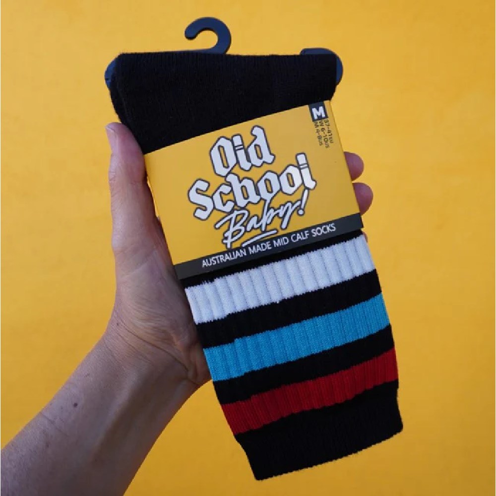 - Features : Mid-high length S, M, or L Designed for action and comfort Small batch socks proudly made in Australia These socks are made of 90% Cotton, 5% Lycra, 5% Nylon - perfect for hard skating sessions!