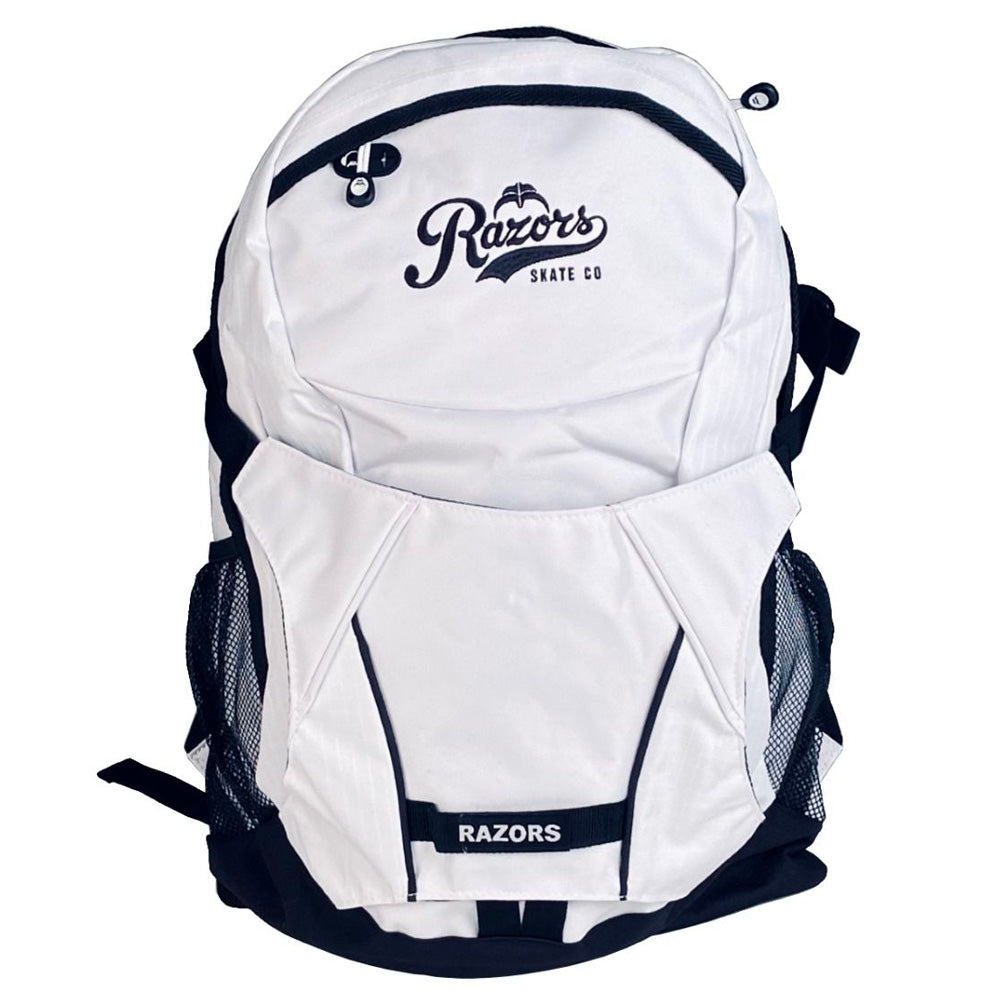 - Features: strong ripstop fabrics media port skate holder Razors embroidery and print on the side articulated, pre-shaped shoulder straps mesh side pockets padded back Dimensions: 135cm (W) x 48cm (H) x 19cm (D) Perfect as a day pack for all your belongings, big enough to fit a couple of books for school and offers easy access to skate storage.